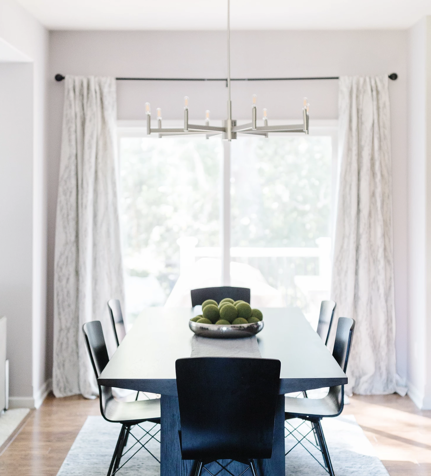 I went with a brushed nickel finish for the new fixture over the dining table, and paired it with a black ceiling fan in the living room. To show off the height of the room, I selected floor to ceiling curtains that have a slight shimmer (bringing in that lux, hotel aesthetic she was dreaming about). And finally, I kept the color palette simple because there was so many design dots to connect. Less needed to be more here – giving the right elements the chance to shine!